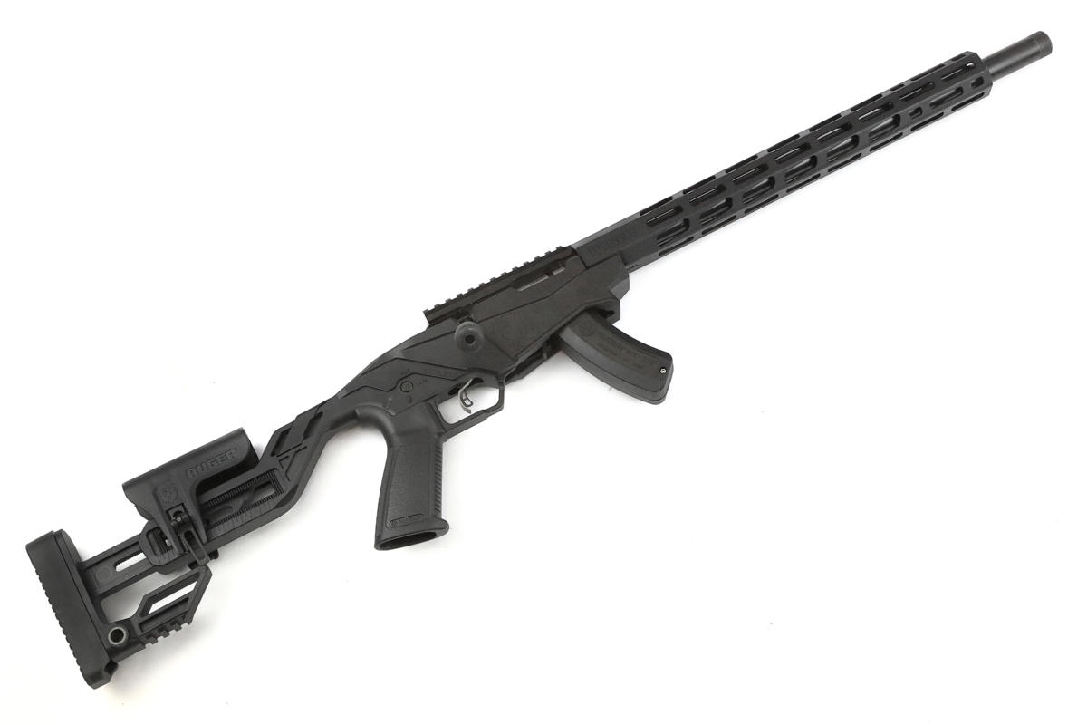 Diese Grundrezeptur des “Großen Bruders” wurde bei der Kleinkaliber-Ausführung, dem Precision Rimfire beibehalten. Das Ruger Precision Rimfire präsentiert sich als Chassis-Gewehr mit vielen innovativen Konstruktionsdetails. AR-kompatibel und vielseitig justierbar wie sein großer Bruder hat es doch einige markante Unterschiede aufzuweisen. Das einteilige Chassis ist nicht aus Leichtmetall sondern aus robustem, glasfaserverstärkem Nylon-Kunststoff gegossen, um so optimale Festigkeit und Stabilität als solide Grundlage für einen präzisen Schuss bieten zu können. Der nicht klappbare Precision Rimfire-Schaft ermöglicht ein schnelle und einfache Anpassung der Abzuglänge und des Schaftrückens. Es ist sogar eine kleine Picatinny Bag Rider Kufe im unteren Bereich am Hinterschaft vorhanden, um eine zusätzliche Schulterstützen-Auflage oder einen Hecksporn anzubringen. Der Ruger-Pistolengriff im AR-Styl bietet einen sicheren Griff. Der übergroße Kammerstengel ermöglicht einen schnellen und fliessenden Repetiervorgang und macht die Handhabung einfach und sicher. Für die Aufnahme von verschiedenen Zieloptiken ist das Ruger Precision Rimfire mit einer Picatinny Schiene mit 30 MOA Neigung ausgestattet. Der 18-Zoll-Target-Lauf ist aus kaltgeschmiedetem 1137-Stahl gefertigt, um ultrapräzise Züge mit hervorragender Genauigkeit zu erreichen. Er verfügt über ein 1/2″-28 Gewinde für Standard-Mündungszubehör und wird mit einem werkseitig installierten Gewindeschutz geliefert, der sowohl das Gewinde als auch die Laufkrone schützt. Der freischwingende 15-Zoll Handschutz besteht aus gehärtetem und schwarz eloxiertem Aluminium und ist an allen vier Seiten mit Magpul® M-LOK®-Schlitzen ausgestattet.