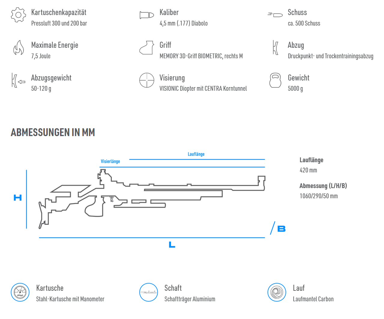 WALTHER BALANCING SYSTEM: Das Balancing-System ermöglicht die individuelle Optimierung der Gesamtmasse, der Balance sowie der Masseverteilung sowohl für den Vorder- als auch für den Hinterschaft mittels 80 g Balancer-Elementen. Diese sind im Vorderschaft sogar stufenlos verstellbar. Der geteilte Hinterschaft ermöglicht die unabhängige Einstellung der Schaftlänge und der Wangenposition, ohne sich gegenseitig zu beeinflussen.