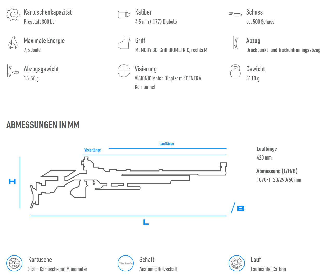 Der neue Anatomic-Schichtholzschaft vereint herausragende Technik mit edler Optik. Sein individueller Maserungsverlauf in Blau-Silbergrau macht jedes Stück zu einem Unikat – ein Blickfang auf jedem Schießstand. In Kombination mit den komplett schwarz eloxierten Metallteilen entsteht eine Waffe, die Spitzenklasse bis ins kleinste Detail verkörpert – sowohl technisch als auch optisch. Für Perfektionisten, die ganz genau hinsehen.